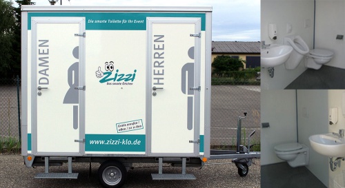 Das mobile Sanitärsytem "Mini" ist geeignet für Veranstaltungen mit bis zu 100 Personen. Er verfügt über zwei Sepparate Toilettenräume mit jeweils einem WC für Damen respektive Herren. Für die Herren ist zusätzlich noch ein Urinal vorhanden.